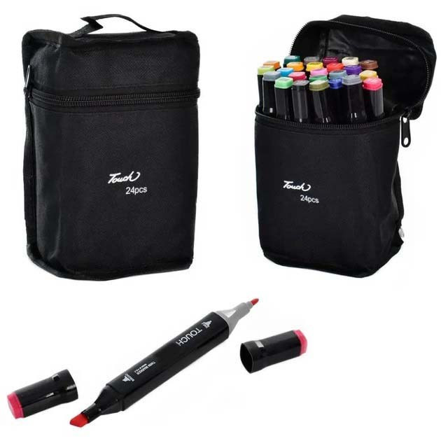 Маркери для малювання та скетчів у пластиковому футлярі. Двосторонні, на спиртовій основі. У наборі 24 шт. Основна палітра оптимально підібрана для малювання всіх стилів.