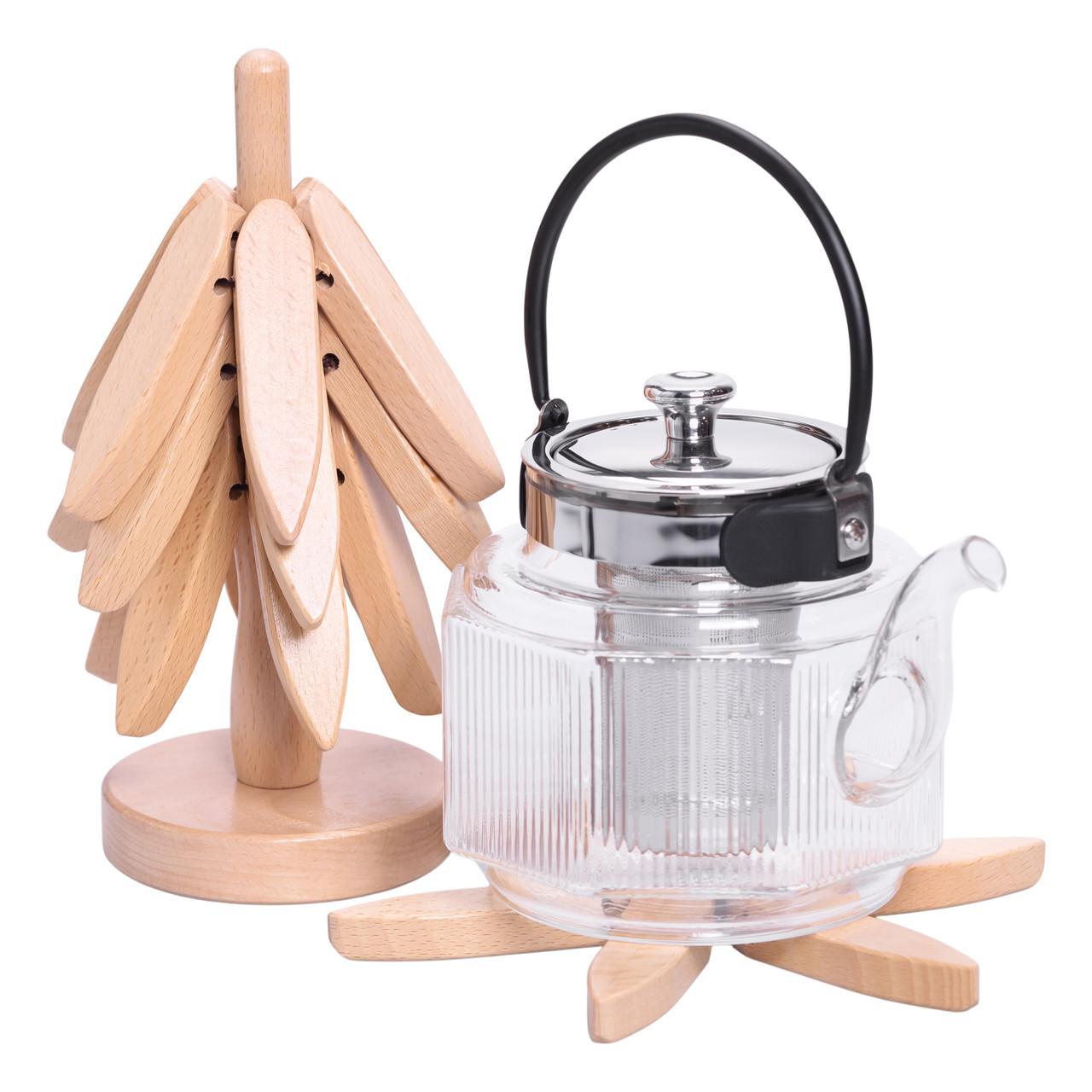 Підставки під гаряче «Дерево» виконані з натурального дерева та мають оригінальну конструкцію у вигляді дерева, на якому розміщуються підставки у формі листочків. Такий формат є зручним для зберігання – всі елементи компактно тримаються на стійкій основі, займаючи мінімум місця на столі або кухонній полиці. Основні характеристики набору підставок під гаряче: Матеріал: бамбук; Діаметр підставок: 19 см; Висота утримувача: 22.5 см; Діаметр утримувача: 9 см; Вага набору: 500 г. Особливості підставок під гаряче з дерева: Виготовлені з натурального дерева, екологічні та безпечні. Надійно захищають поверхню столу від високих температур та подряпин. Компактно складаються на спеціальній дерев'яній стійці, заощаджуючи місце на кухні. Зручні у використанні – легко діставати та ставити назад. Стильний та акуратний дизайн підходить для будь-якого інтер'єру. Довговічні, витримують регулярне використання. Кожна підставка надійно захищає поверхню від слідів гарячих чи холодних напоїв, запобігаючи появі плям та подряпин. Натуральне дерево приємне на дотик, має привабливу текстуру та легко очищається від забруднень. Конструкція стійка та практична для повсякденного використання. Такий набір стане не тільки функціональним елементом для кухні або вітальні, але й оригінальною деталлю інтер'єру. Він підходить для дому, офісу або як подарунок.